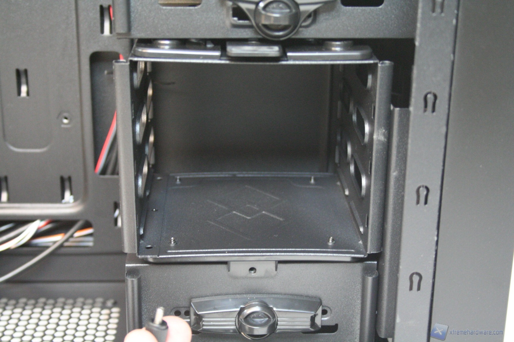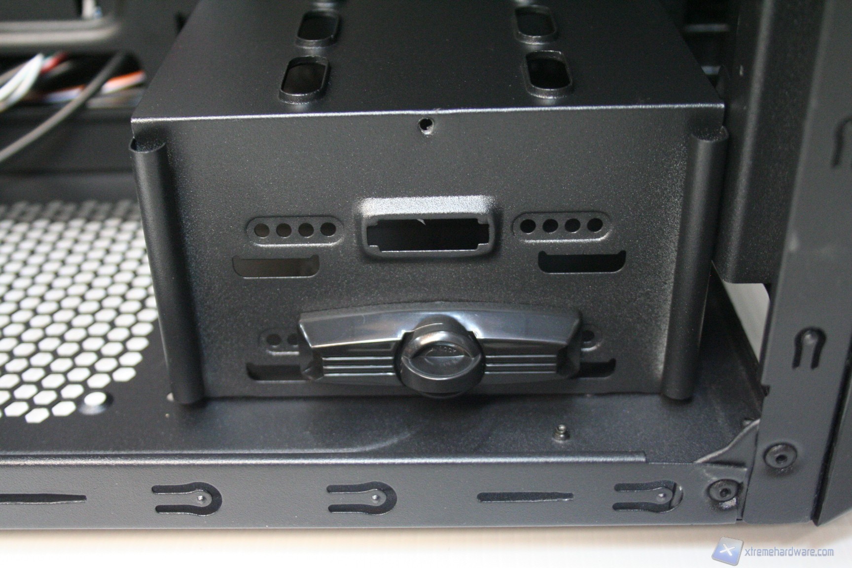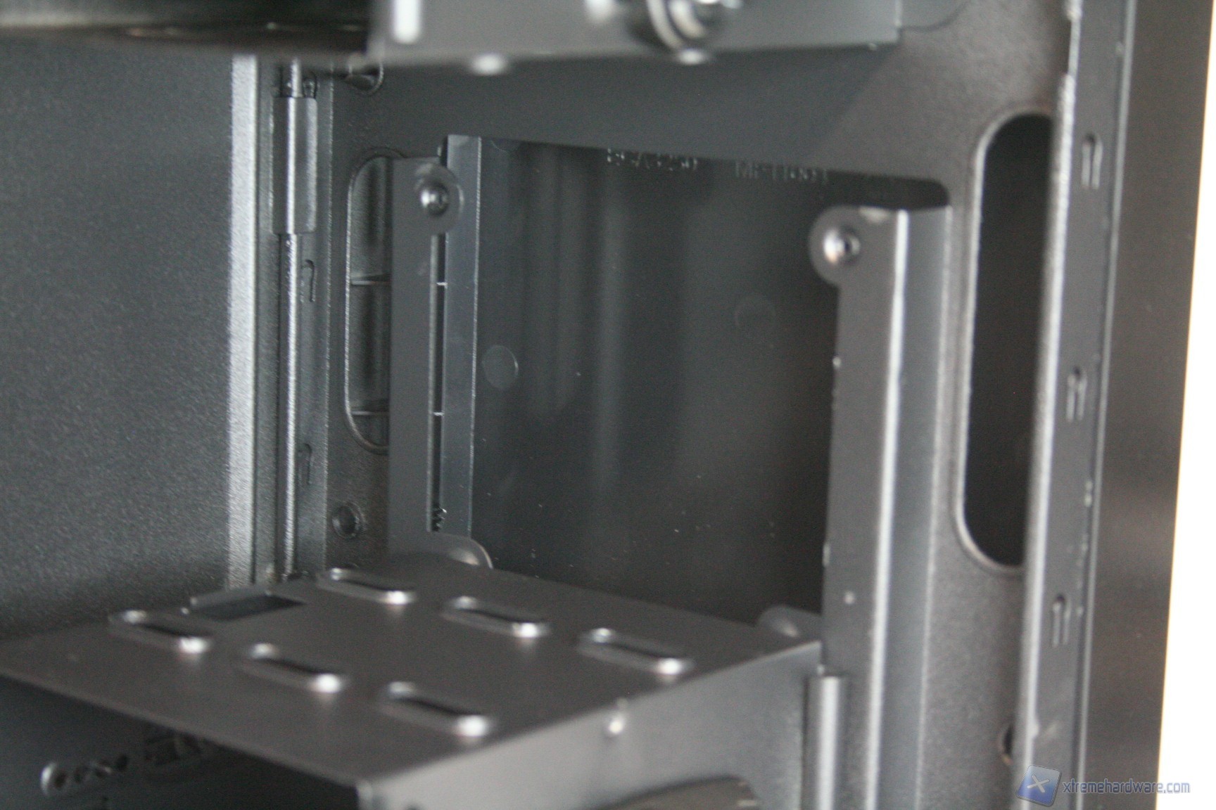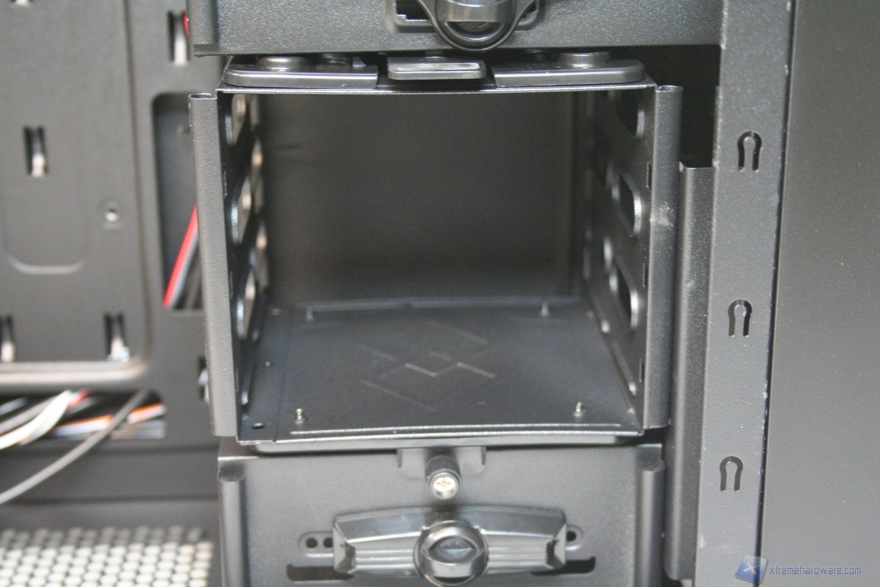 La gestione degli hard disk presenta una particolare conformazione a due cage, uno dei quali facilmente removibile per far spazio a lunghe schede video, e l’altro, inferiore, removibile solo con una procedura più complessa (sono presenti dei rivetti). I cage supportano fino ad un totale di 5 dischi da 3.5” e sono dotati di due differenti tipi di aggancio: il cage più grande tramite slitte e quello in basso, con disposizione ortogonale al precedente, tramite meccanismo di blocco rotazionale. Lo stesso tipo di aggancio tool-less è previsto per gli slot da 5,25”. Purtroppo non c’è compatibilità con SSD e hard disk da 2,5” se non tramite adattatori a 3,5” non inclusi nel cabinet.