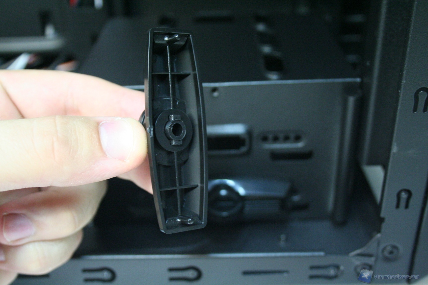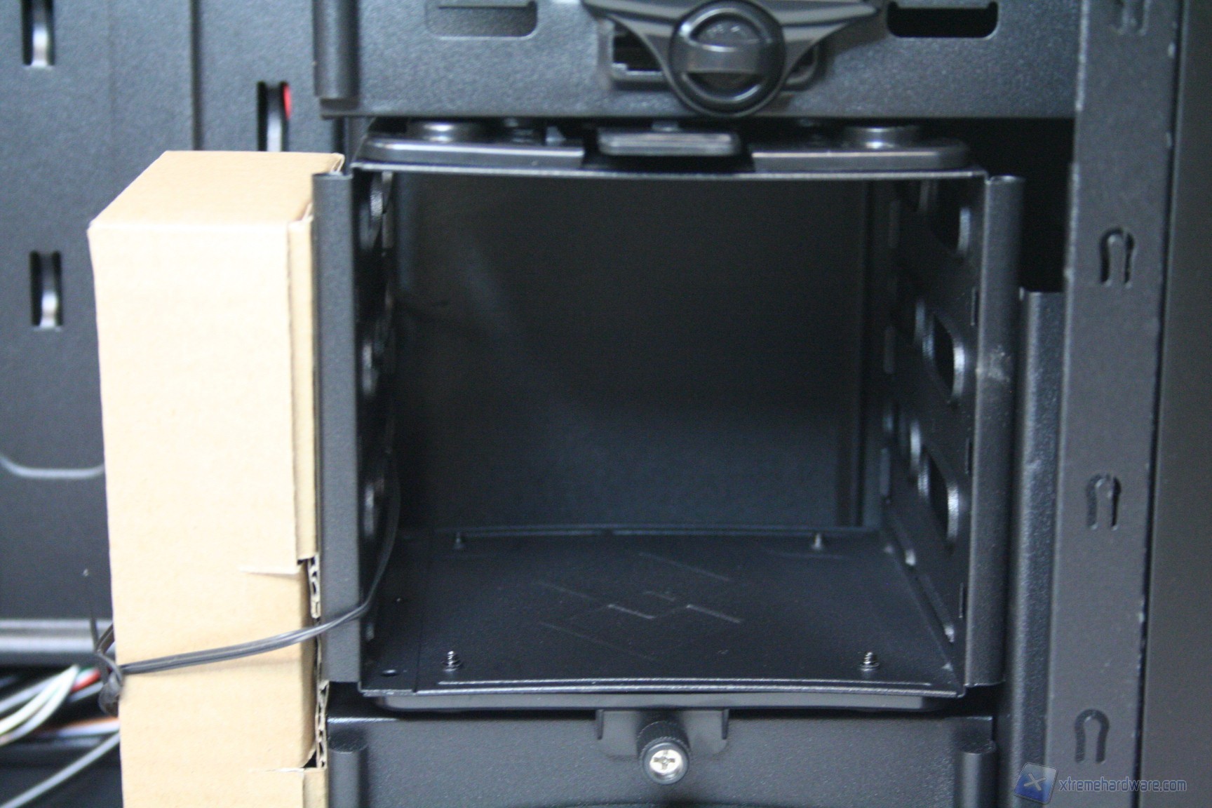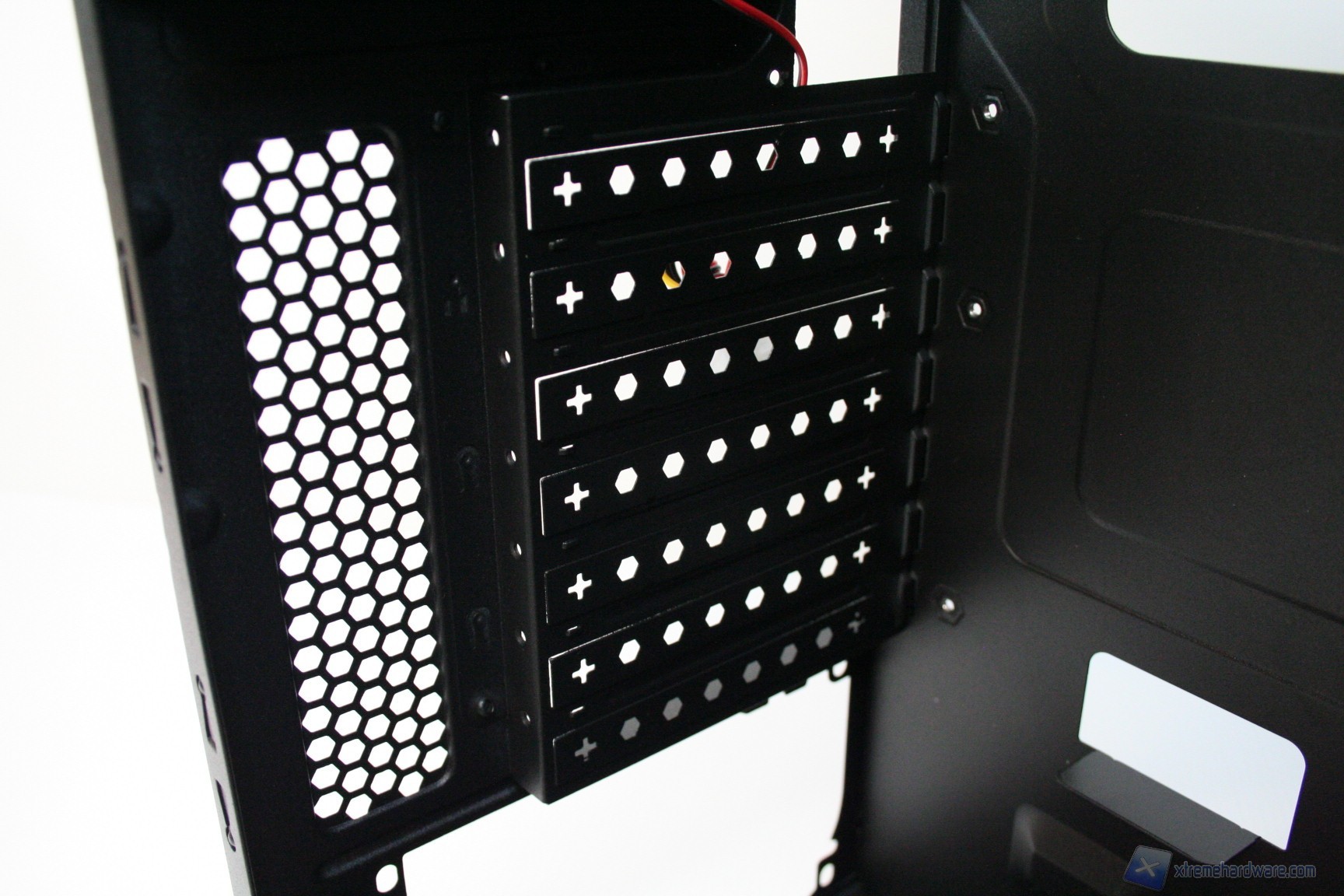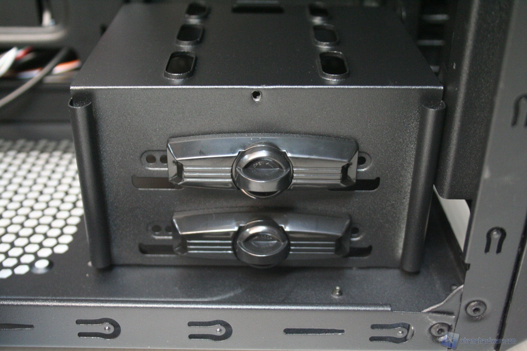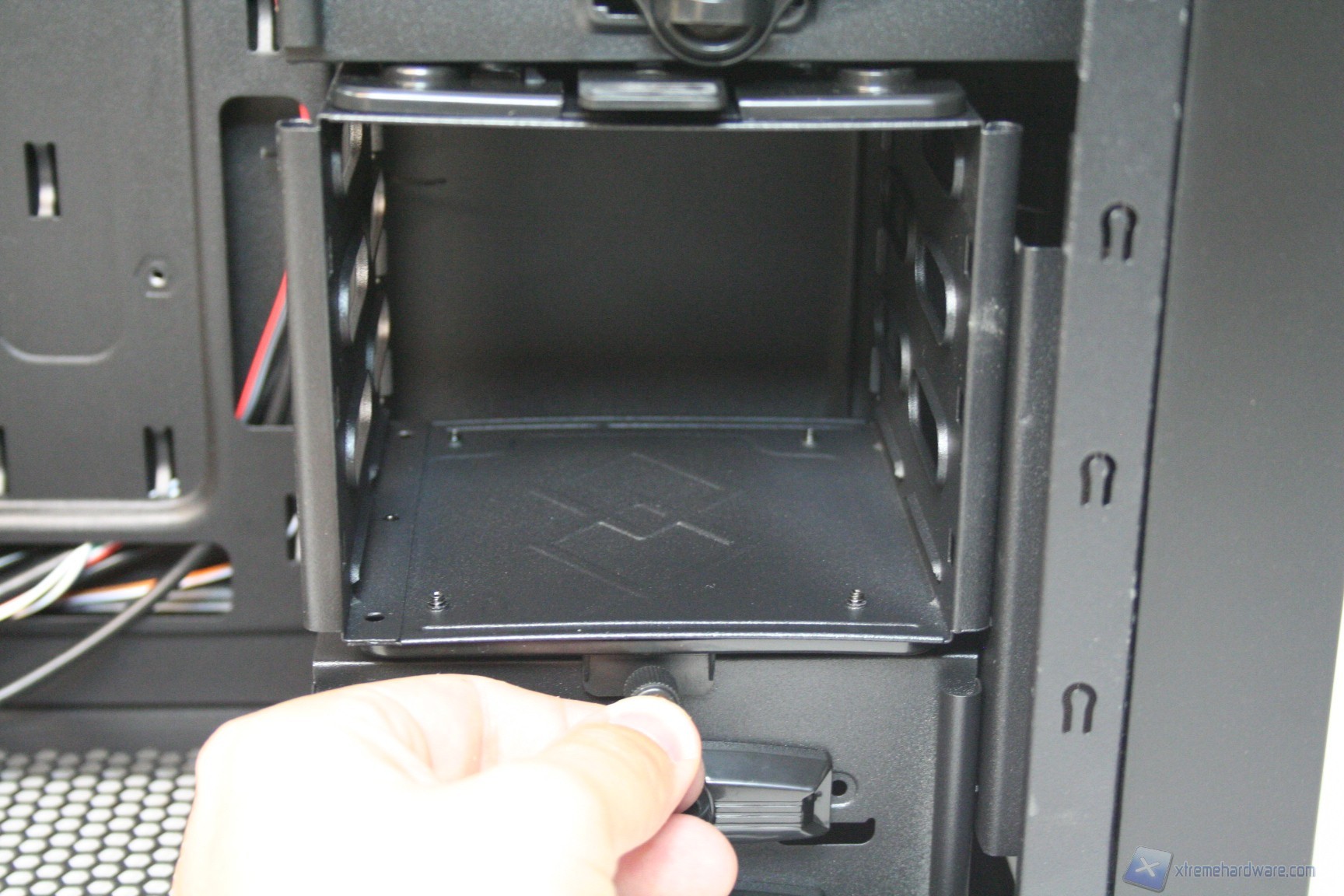 La gestione degli hard disk presenta una particolare conformazione a due cage, uno dei quali facilmente removibile per far spazio a lunghe schede video, e l’altro, inferiore, removibile solo con una procedura più complessa (sono presenti dei rivetti). I cage supportano fino ad un totale di 5 dischi da 3.5” e sono dotati di due differenti tipi di aggancio: il cage più grande tramite slitte e quello in basso, con disposizione ortogonale al precedente, tramite meccanismo di blocco rotazionale. Lo stesso tipo di aggancio tool-less è previsto per gli slot da 5,25”. Purtroppo non c’è compatibilità con SSD e hard disk da 2,5” se non tramite adattatori a 3,5” non inclusi nel cabinet.