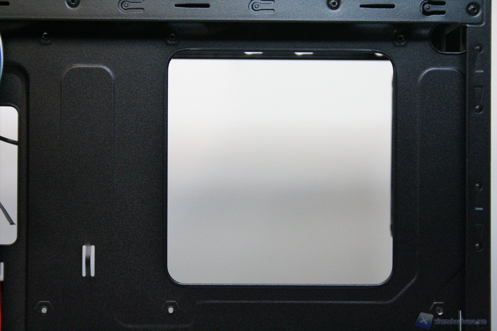 Una volta rimossa la scomoda paratia laterale, possiamo notare fin da subito che sebbene sia una soluzione economica, nulla è stato lasciato al caso e presenta una configurazione moderna. Abbiamo apprezzato il fatto che sulla carta non supporta schede madri E-ATX, mentre in realtà abbiamo potuto installare una Rampage II Extreme, rinunciando soltanto ai fori per il passaggio dei cavi. E’ spazioso quanto basta per un potente sistema e permetterà persino l’integrazione di sistemi a liquido dalla media potenza. Sorge spontanea una domanda: cosa si può volere di più da un cabinet tanto economico?