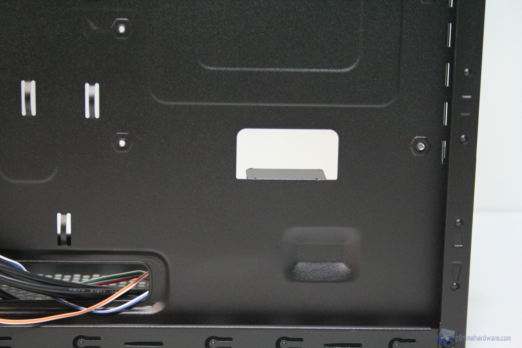 Una volta aperta la parte laterale destra possiamo osservare la grande apertura per l’installazione di sistemi di ritenzione avanzati, per dissipatori aftermarket. Lo spessore è decisamente contenuto, il che significa che si avranno delle difficoltà nel far passare cavi spessi dietro al piatto della scheda madre, rischiando di deformare anche quella porzione della paratia. Il cablaggio è comunque facilitato dalla presenza di un buon numero di passacavi, ed in particolare di grandi aperture in prossimità dei connettori SATA e di alimentazione (20+4PIN) della scheda madre. Sono presenti due altre aperture, una inferiore ed una proprio a ridosso dell’alimentatore, oltre ad una minuscola apertura nell’angolo in alto in prossimità del connettore da 4+4PIN della scheda madre. Lo spazio posteriore agli hard disk è discreto, data la tipologia di cabinet sarebbe stato difficile chiedere di più. La solidità strutturale è leggermente più elevata della media in questa fascia di prezzo.